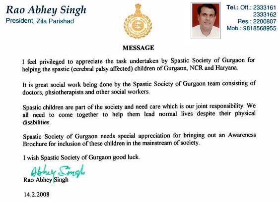 Message from Sh. Rao Abhey Singh - President Zila Parishad, Gurgaon...