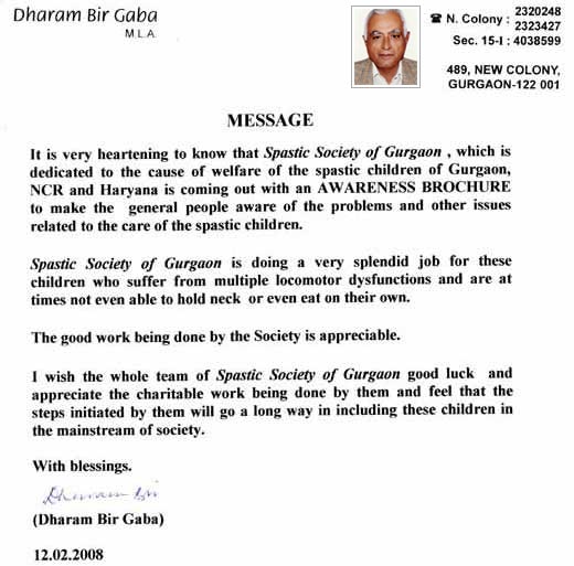 Message from Sh. Dharam Bir Gaba - MLA, Gurgaon...